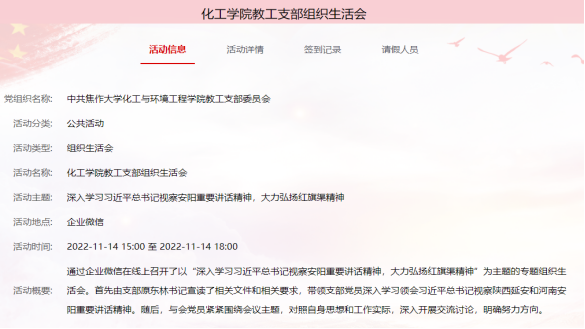 为使此次专题组织生活会顺利召开,会前,教工支部和学生支部分别通过电话、微信平台等方式向全体党员传达了深入学习贯彻党的二十大精神和习近平总书记视察河南安阳重要讲话精神的通知,并督促党员同志通过学习强国平台学习习近平总书记视察河南安阳重要讲话精神和收看中央电视台《国家记忆》栏目播出的专题片《根脉---红旗渠精神》。与此同时,学院党总支广泛收集红旗渠精神、焦作特有的“特别能战斗”精神、叠彩洞精神等相关文献资料。