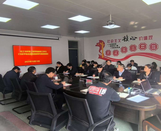 2025年9月10日是我国第41个教师节。9月8日,习近平总书记给全国特岗教师代表回信,提出殷切希望,并向全国广大教师和教育工作者致以节日祝贺和诚挚问候。为深入领会习近平总书记回信精神,进一步凝聚教育共识,汲取奋进力量,2025年10月13日,化工学院组织全体教师在学院会议室开展了对习近平总书记给全国特岗教师代表回信内容的学习活动。