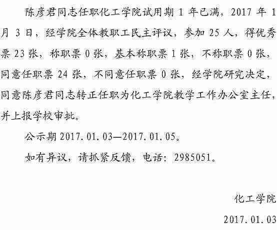关于陈彦君同志试用期结束化工学院同意其转正的公示