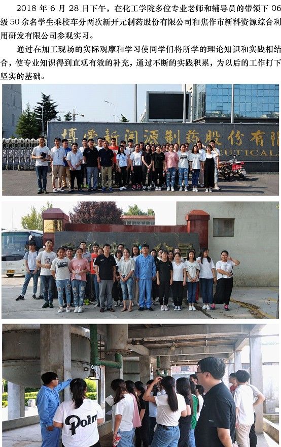 化工学院组织学生到新开元制药股份有限公司和焦作市新科资源综合利用研发有限公司参观实习
