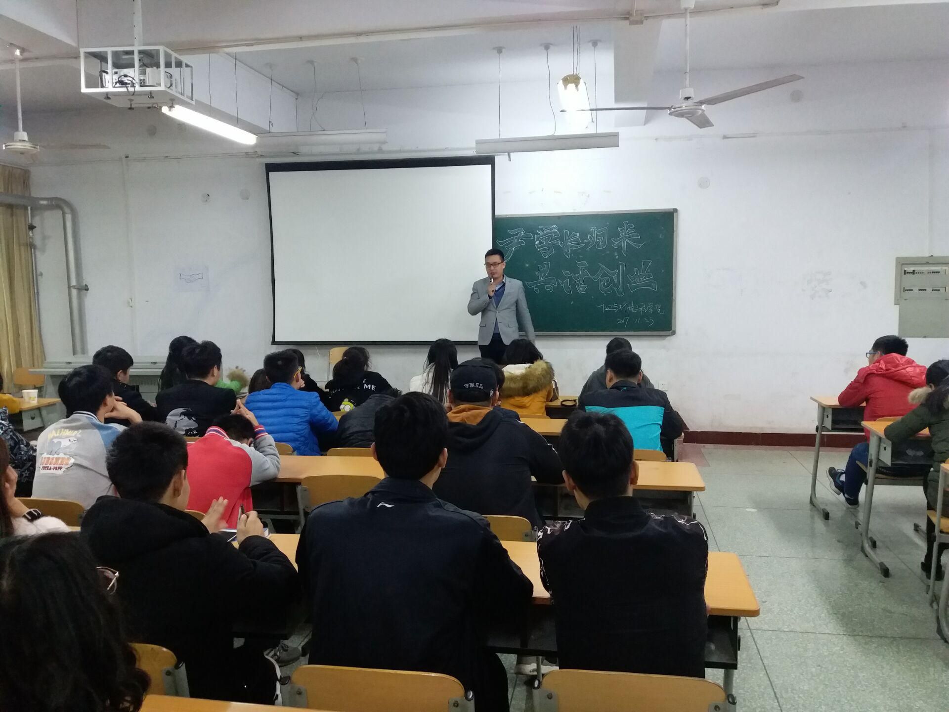 2017年11月23日,304永利集团优秀毕业生尹建坡学长重归母校,在崇学楼2601教室与化工学院2016级学生共话创业与就业。