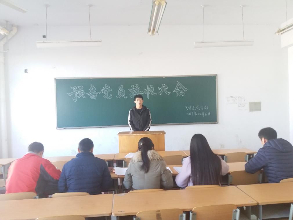 2017年12月6日下午,我系学生支部在二号教学楼2523教室召开了预备党员接收大会,讨论关于刘志明等8名发展对象的接收问题。学工办主任何芳、宣传委员燕兴海、组织委员董萌萌及刘中阳老师出席了本次大会,大会由贺龙强同志主持。